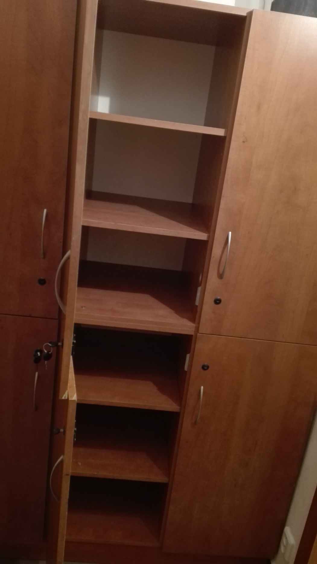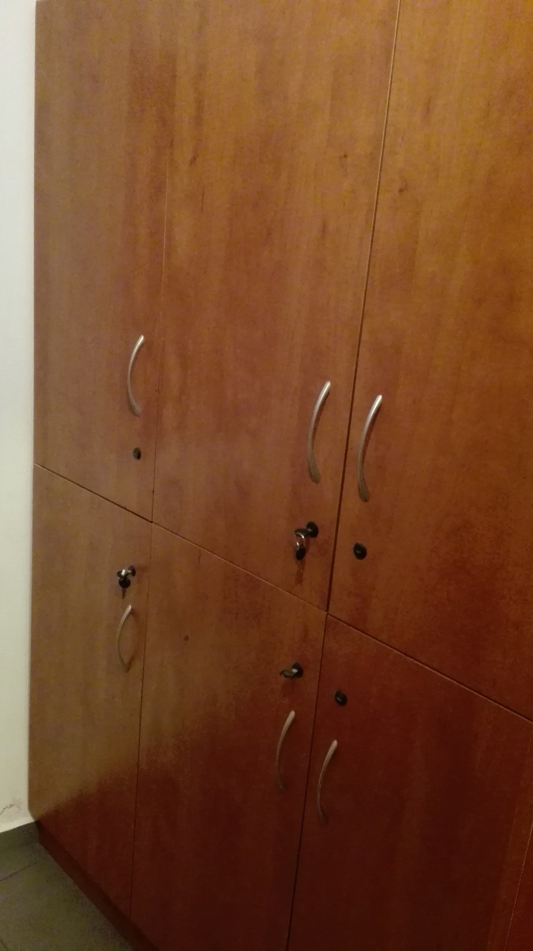 Prodám uzamykatelné šatní skříňky a uzam. skříňky na materiál. Šatní skříň - výška 200cm, šířka 1x66cm, 1x33cm, hloubka 50cm.Škříňka na materiál - výška 200cm, šířka 1x45,5cm, 1x91cm, hloubka 60cm, na levé straně je směrem dozadu mírně zůžená. Dále prodám věšák a sklápěcí stolek.