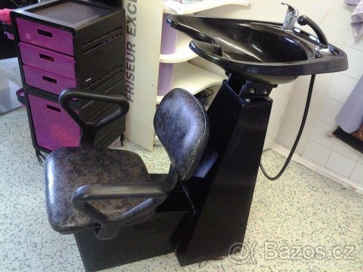 Kadeřnický mycí box, hodně používaný. Plastové umyvadlo s kohoutkem i sprchou.
